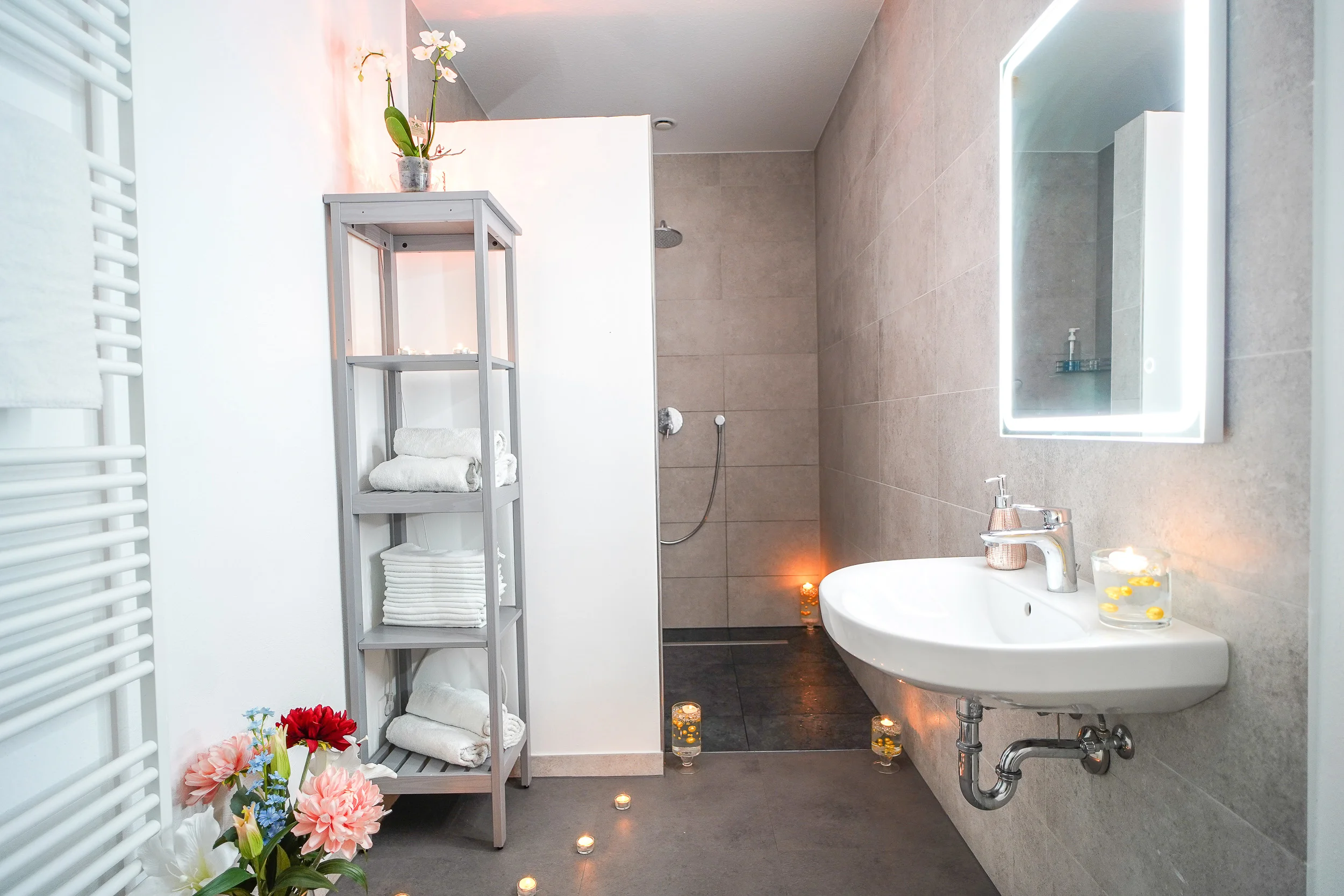 Tauche ein in Oasen der Sinnlichkeit und Entspannung, wo jedes Bad ein einzigartiges Erlebnis verspricht. Unsere drei exquisit gestalteten Badezimmer sind der Inbegriff luxuriöser Erfrischung und intimer Momente. Mit viel Liebe zum Detail haben wir diese Räume geschaffen, um dir eine perfekte Mischung aus Hygiene und Verführung zu bieten. Von der großzügigen, begehbaren Dusche bis zum einladenden Whirlpool – jedes Element ist darauf ausgerichtet, deine Sinne zu verwöhnen und dich in eine Welt der Entspannung zu entführen. Lass dich von der stimmungsvollen Beleuchtung, den hochwertigen Armaturen und den kleinen Extras wie Kerzen und frischen Blumen verzaubern. Hier findest du den idealen Rahmen für ein belebendes Vorspiel oder eine wohltuende Erfrischung nach deiner Massage. Genieße die perfekte Symbiose aus Komfort und Erotik in einem Ambiente, das deine Fantasie beflügelt und unvergessliche Momente verspricht.